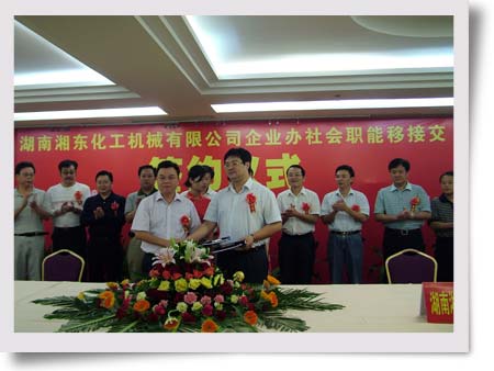 10月10日,湖南湘東化工機械有限公司企業(yè)辦社會職能移交攸縣人民政府簽約儀式在海悅國際大酒店舉行。會議由省石化行業(yè)管理辦公室主持,省石化行業(yè)管理辦公室副主任方忠、改制辦處長唐輝島,株洲市勞動局副局長李國華,湘東化機董事長兼總經(jīng)理蘇成、黨委書記林德晁、副總經(jīng)理姜衡陽、副總師兼改制辦主任陽炳伏,攸縣縣委書記鄺鄒飛,攸縣縣委副書記、縣長胡湘之,攸縣各職能部門領(lǐng)導出席了會議。