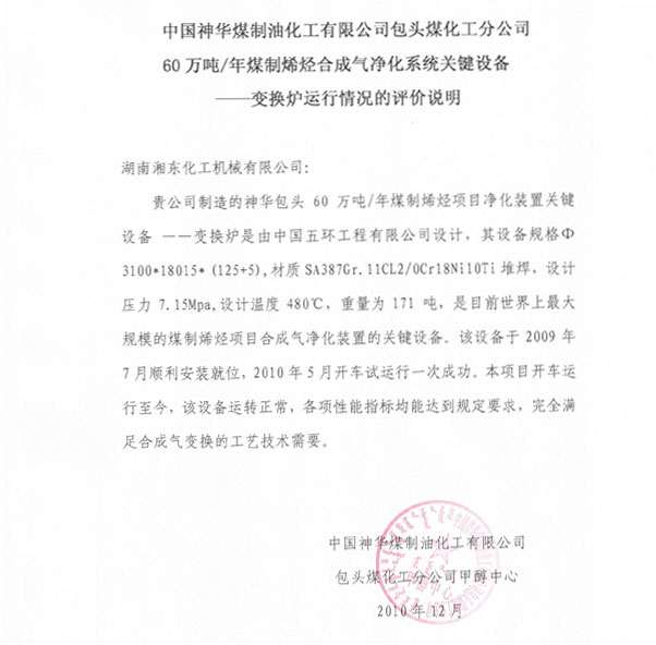 近日,中國(guó)神華煤制油化工有限公司包頭煤化工分公司甲醇中心在對(duì)我公司發(fā)來(lái)的賀信中說到: