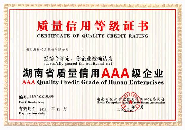 近日,湘東化機(jī)喜獲湖南省企業(yè)質(zhì)量信用等級(jí)評定委員會(huì)頒發(fā)的“湖南省質(zhì)量信用AAA級(jí)企業(yè)”證書。證書編號(hào)為HN/ZZ10306,有效期至2014年11月。該榮譽(yù)的獲得,標(biāo)志著湘東化機(jī)在加強(qiáng)質(zhì)量保證體系建設(shè)方面取得了新突破。